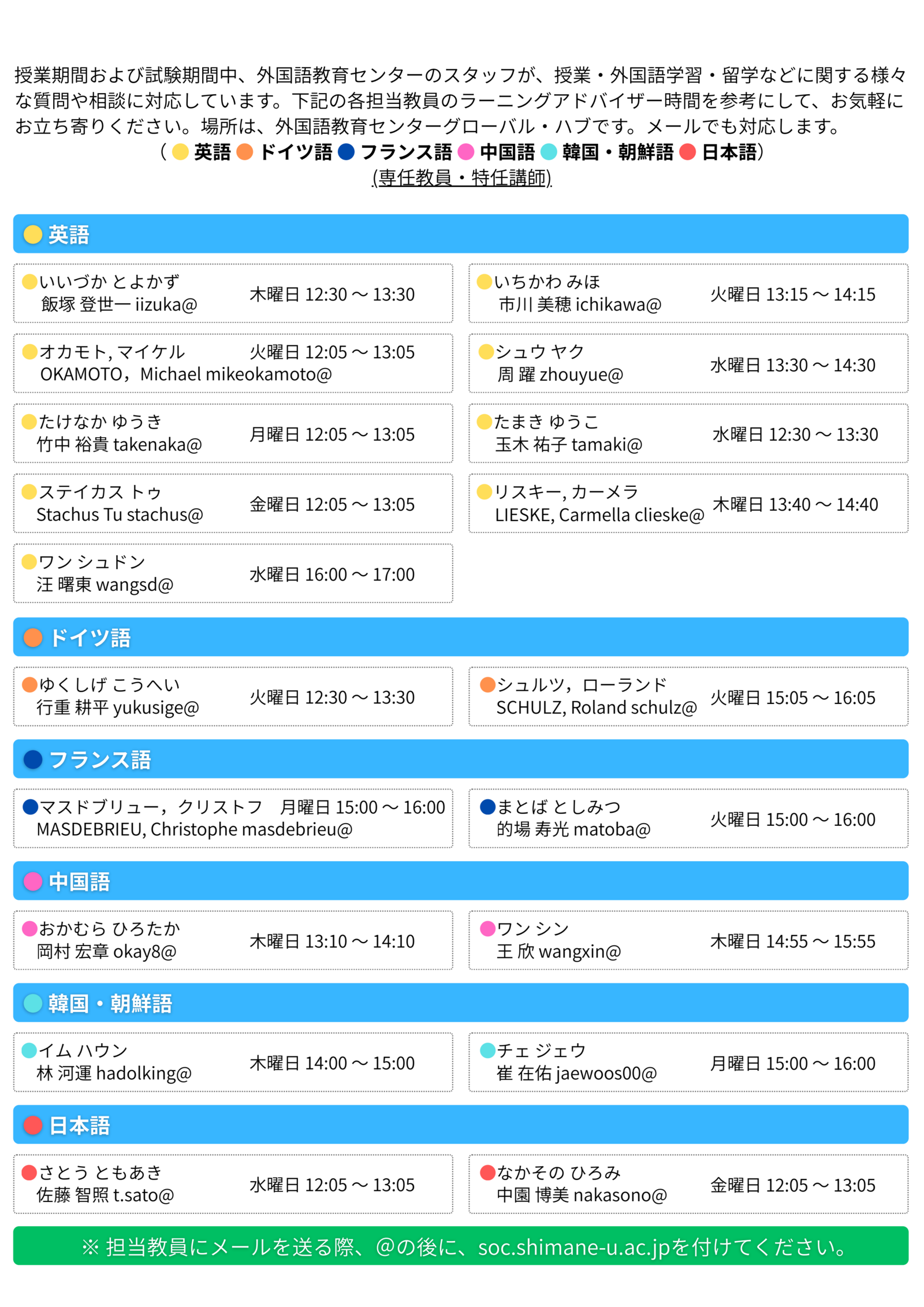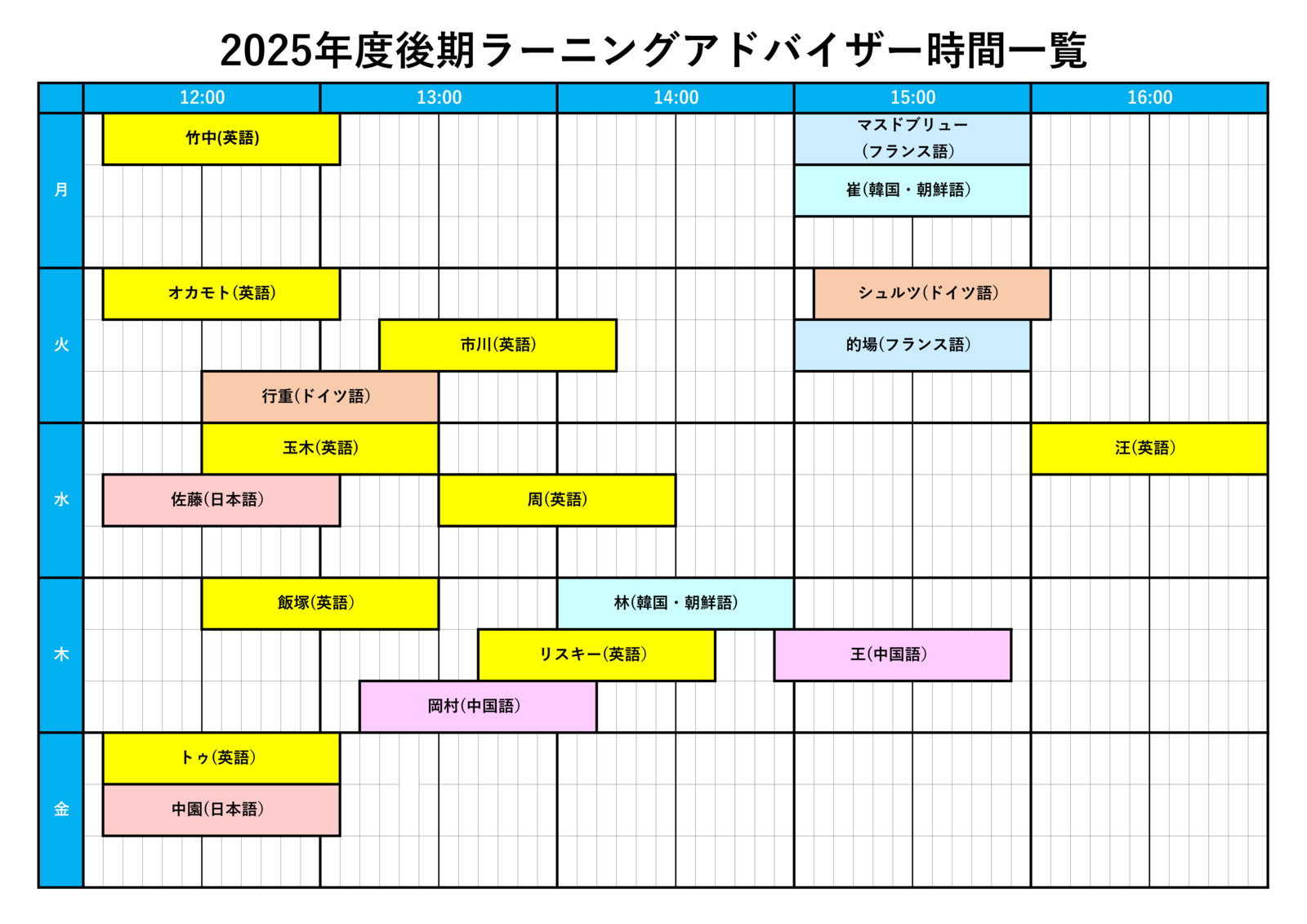 2025年度後期ラーニングアドバイザー時間一覧表